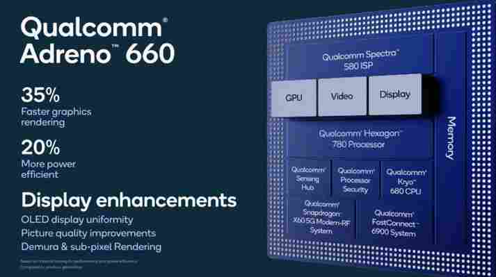 Qualcomm zároveň posílil i integrované GPU, které má označení Adreno 660. U toho má výkon proti Snapdragonu 865 stoupnout dokonce o 35 %. Pomůže mu asi také použití rychlejších pamětí. Snadpragon 888 už podporuje jenom LPDDR5, a to s rychlostí LPDDR5-6400, což dává propustnost až 51,2 GB/s (jsou použité čtyři 16bitové kanály, tedy ekvivalent jednoho kanálu DDR4). GPU má údajně mít posílený výkon v AI akceleraci a také nově implementuje Variable Rate Shading z DirectX 12 Ultimate (ale ne další součásti jako ray tracing).