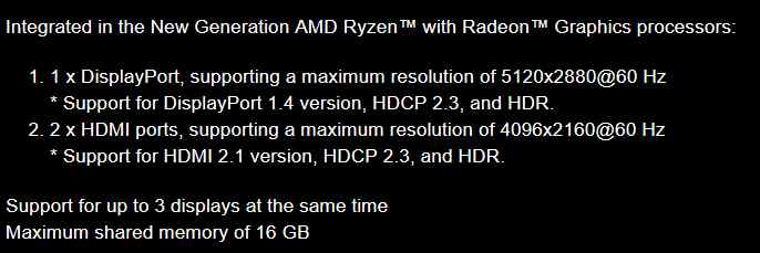 Zatímco tady jsme vás asi nepotěšili, dobrá zpráva je u výstupu integrované grafiky. Současná APU Ryzen 2000 a 3000 umí maximálně rozlišení 4K, ale APU Renoir zdá se bud posíleno a jeho výstup podporuje rozlišení až 5120 × 2880 bodů s obnovovací frekvencí 60 Hz (podle ASRocku dokonce i na 120 Hz). Toto je při použití výstupu DisplayPort, který je poskytnut ve verzi 1.4 – ale samozřejmě musíte koupit desku, kde tento výstup bude (doufejme, že nebude trvat situace, kdy je výrobci osazovaly hlavně na desky Intel a u MD ne).