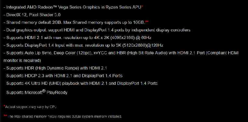 Integrovaná grafika také podporuje HDR, ochranu obsahu proti kopírování HDCP 2.3 a pozor, ve specifikacích desek Gigabyte se píše, že „nová generace procesorů AMD Ryzen™ with Radeon™ Graphics“ (čímž se asi myslí Renoir/Ryzen 4000G) na B550 deskách přinese podporu pro HDMI 2.1 (potvrzují to i specifikace Asusu a ASRocku). Na to v osobních počítačích dosud marně čekáme, zatím ho žádné GPU neumělo.
