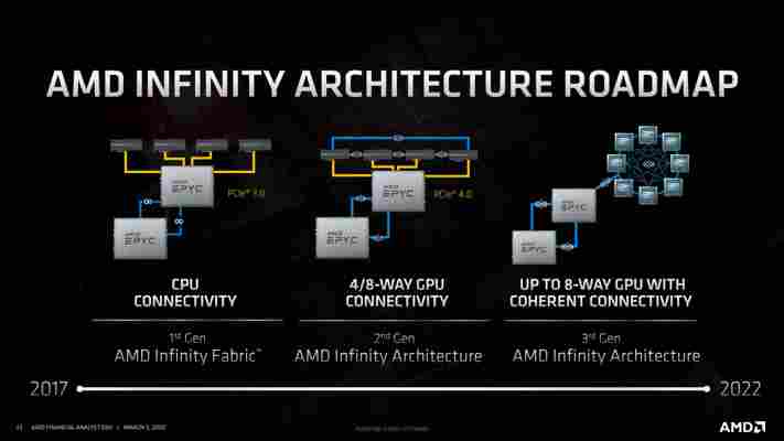 Procesory Genoa mají v tomto systému využívat k propojení s externími GPU Infinity Fabric, respektive „Infinity Architecture“ třetí generace. Ta má poskytovat více než dvojnásobnou propustnost proti rozhraní PCIe 4.0, takže fyzicky asi bude použitá technologie PCI Express 5.0, kterou tím pádem Epyc 4. generace zřejmě bude podporovat. Ovšem nad touto základní vrstvou bude použito koherentní propojení (to Epyc 2. generace pro komunikaci s GPU nepoužívá). Tato Infinity Architecture (3.0) má podporovat koherentní propojení až osmi GPU navěšených na jeden procesor.