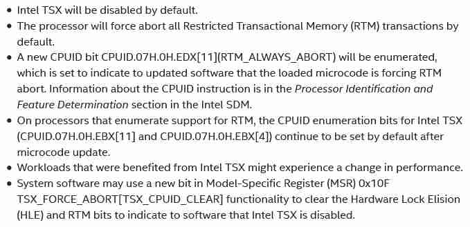 Zdá se, že to nebude provedeno přímo „zmizením“ tohoto rozšíření. Aktualizace způsobí, že všechny pokusy softwaru použít toto rozšíření budou procesorem automaticky hned zrušeny a efekt TSX zvyšující výkon tedy nebude dosažen. Toto se má stávat při použití funkce Restricted Transactional Memory (RTM). Není zmíněno, že by procesor takto automaticky sabotoval také použití funkce HLE (Hardware Lock Elision), což by dávalo naději, že tuto část TSX bude možné použít. Jenže vedle toho také Intel uvádí, že „TSX will be disabled by default“, což by implikovalo dekativaci celé této technologie.