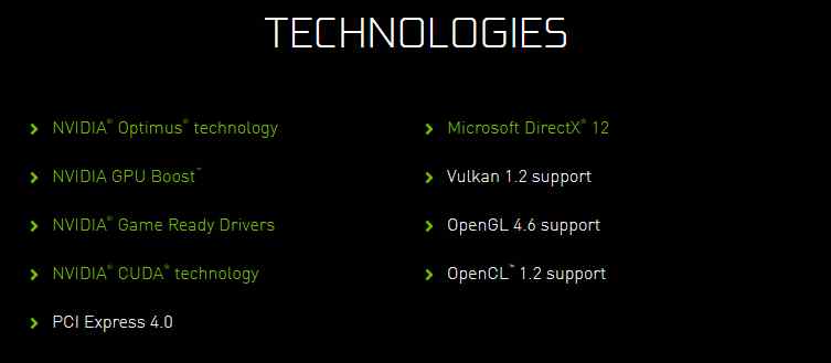 Nvidia bohužel nesděluje parametry, jen že GPU podporuje obvyklé propriety, DirectX 12, Vulkan 1.2, OpenGL 4.6 a OpenCL 1.2. Ovšem nikoliv ray tracing, který jste ale asi ani nečekali, když GPU nenese označení RTX. Počty shaderů a takty nejsou sdělené, jen že GPU může být v noteboocích osazeno pamětí GDDR5, nebo i GDDR6.