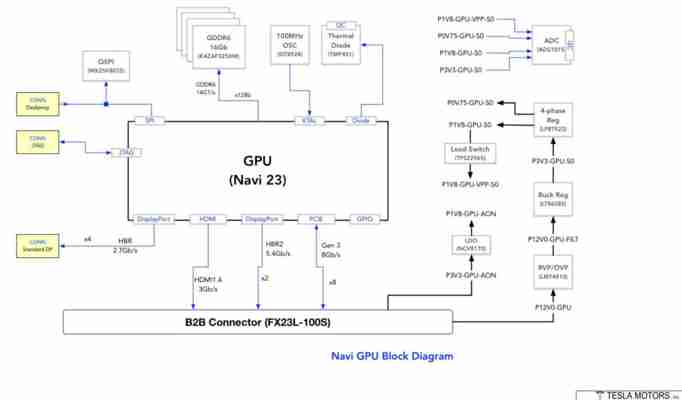 Twitterový leaker, který toto tvrdil už před časem, nyní publikoval schéma zapojení GPU, které by mělo popisovat osazení GPU v systému. Podle tohoto schématu jde o Navi 23, ke kterému budou připojené obrazovky přes signál HDMI a DisplayPort (přes B2B sběrnici auta). GPU bude připojené přes sběrnici PCI Express 3.0 ×8 a zajímavá informace je, že GPU má 128bitovou paměťovou sběrnici – nebo aspoň takováto šířka je z ní reálně využitá, pokud náhodou čip umí víc. Paměti GDDR6 mají podle schématu 8 GB (4× 16Gb čip) a efektivní frekvenci 14,0 GHz. To je propustnost 224 GB/s, ale čip má nejspíš navíc také nějakou Infinity Cache, díky níž bude mít vyšší výkon, než kolik by běžně taková propustnost dovolovala.