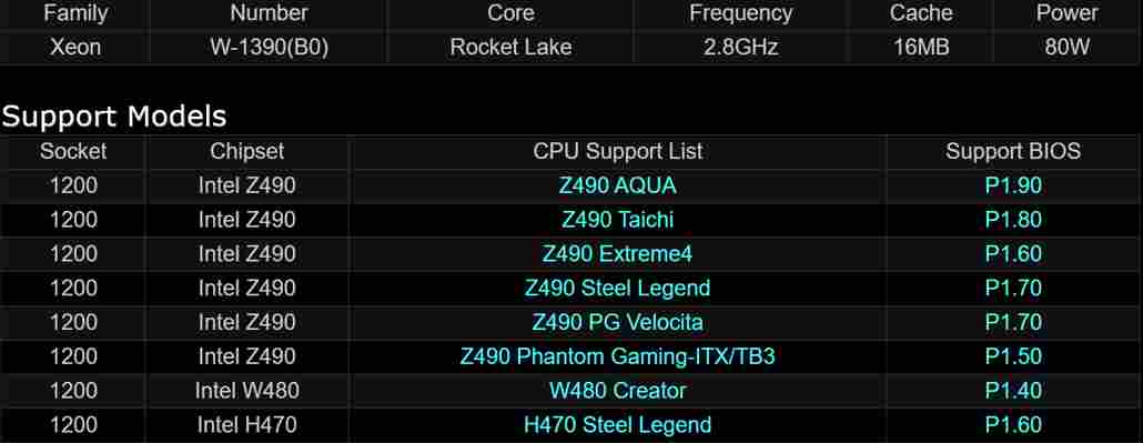 Údaje v databázi ASRocku uvádějí pět modelů s částečnými parametry. Nabídka začíná u Xeonu W-1350 a Xeonu W-1350P, které mají 12MB L3 cache a jsou to proto zřejmě šestijádra. Model Xeon W-1350 má 80W TDP a základní frekvenci 3,3 GHz, verze Xeon W-1350P má vyšší TDP 125 W a díky tomu základní frekvenci 4,0 GHz. Takty boostu bohužel neunikly.