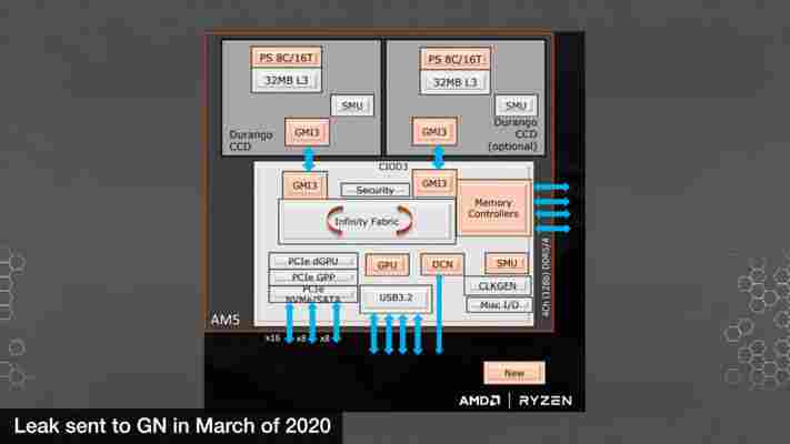 GamersNexus dále ukázal další dva slajdy ukazující schéma procesoru a platformy. Zde je opět vidět jen dvoučipletová konfigurace (takže 16jádro s 2×32 MB L3 cache). Ale opět tu máme doklad toho, že AMD měnilo plány. Schéma například ukazuje, že IO čiplet měl původně mít řadič pamětí nejen pro DDR5, ale i pro DDR4. Toto už neplatí, Raphael bude nakonec umět jen DDR5, jak uvádí ExecutableFix. Ten také uvádí, že čip bude mít 28 linek PCI Express 4.0, z čehož zřejmě něco zrekvíruje připojení k čipsetu. Na zde uniklém starém schématu ještě je 32 linek (z nichž něco by bral čipset), ale toto už tedy neplatí.